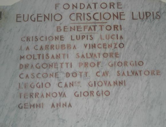 La costruzione della casa, destinata ad ospitare poveri ed anziani, avvenne dopo la sua morte e, contestualmente fu istituita l’Opera Pia “Ritiro dei Poveri Eugenio Criscione Lupis”.